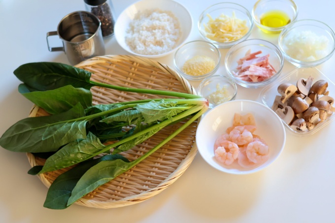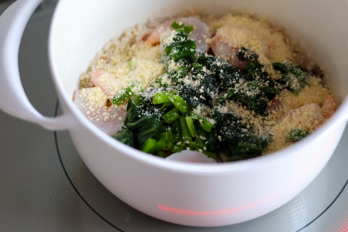 ・炊いたリゾットにホウレン草、海老、粉チーズを加えて全体をよく混ぜながら弱火にかける。(※1分程度)