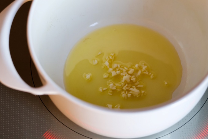 ・ユニロイにオリーブオイルとにんにくを入れて弱火にかけ香りを出す。