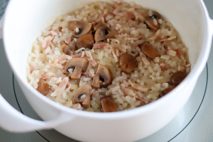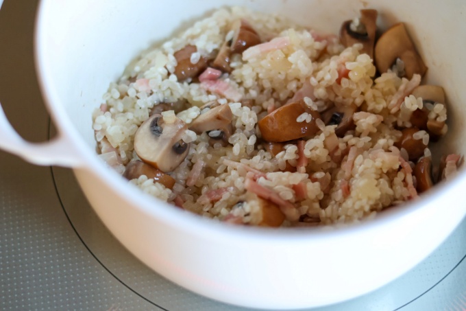 ・タマネギから炒め、甘い香りが立ってから、マッシュルーム、ベーコン、生米を入れて炒める。(※米が透き通るまで。)