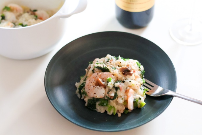#野菜ソムリエ #イタリアン #リゾット #ホウレン草 #エビ #マッシュルーム #チーズ #白ワイン #おうちカフェ #おしゃれごはん #貧血予防 #美肌