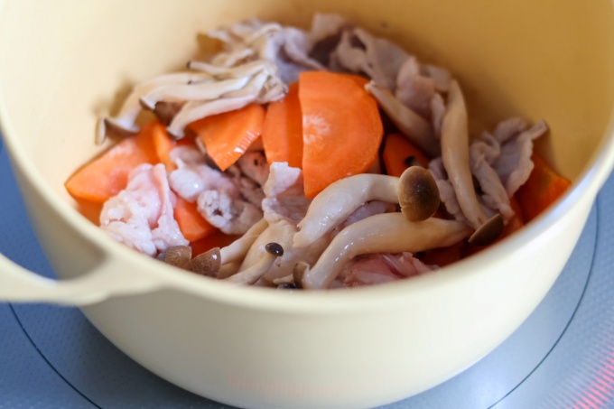 ・ユニロイにごま油を入れて熱し、しょうがを入れて炒め、香りが立ってから豚肉、人参、しめじを中火で炒める。