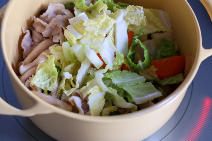 ・最後に白菜を入れて全体をざっくりとかき混ぜてから(A)を入れて蓋をし、中火で2分程煮込む。