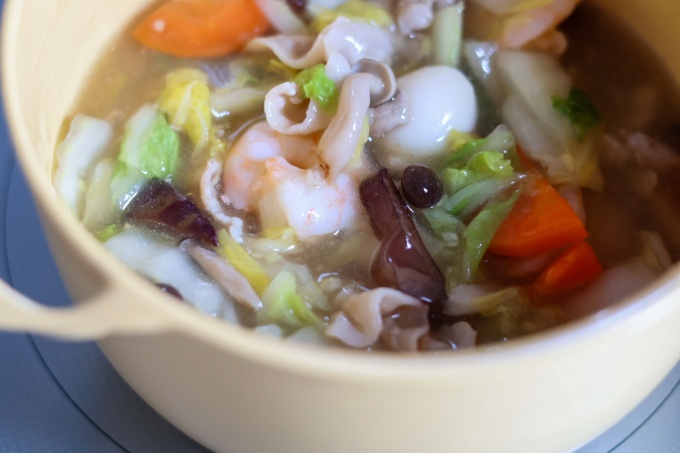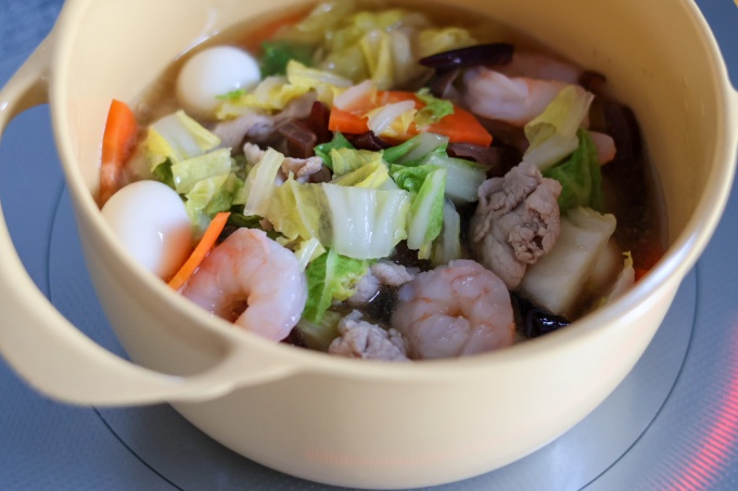 ・蓋を開けて、うずらの卵、海老、きくらげを入れてから一度火を止める。
