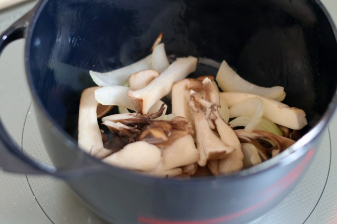 ・ユニロイに油を入れて熱し、たまねぎ、まいたけ、エリンギを中火で炒める。