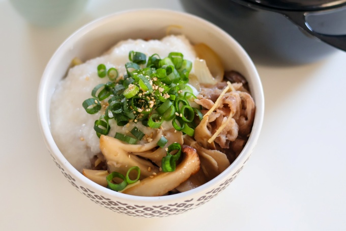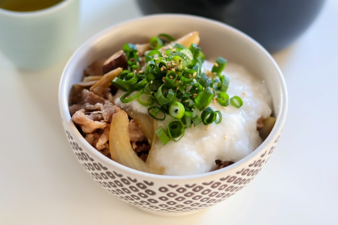 家でも簡単に作れる牛丼に舞茸とエリンギ、長芋のすりおろしを加えて美味しくバランスよくヘルシーに仕上げています。
