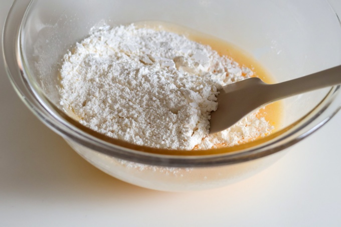 ・粉ふるいにかけた薄力粉とベーキングパウダーを入れてゴムベラを使いさっくりと混ぜ合わせる。※生地が硬くなるので練らない!
