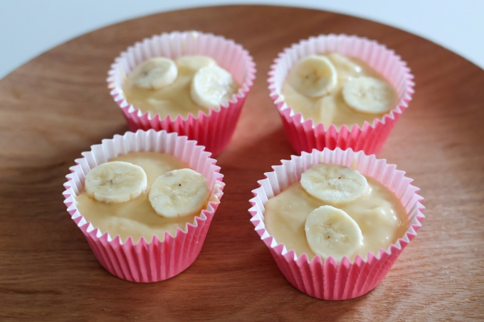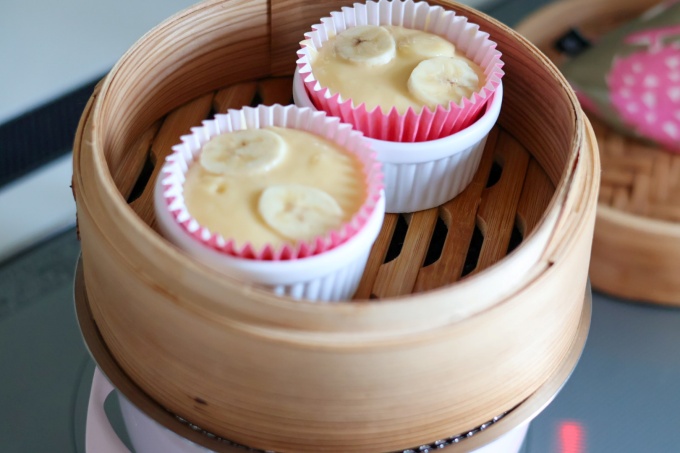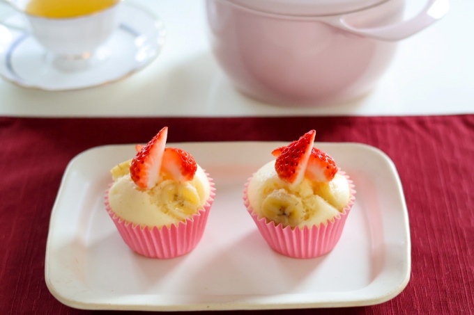 ・耐熱カップに生地を流し入れ、残りのバナナを乗せて型に入れる。