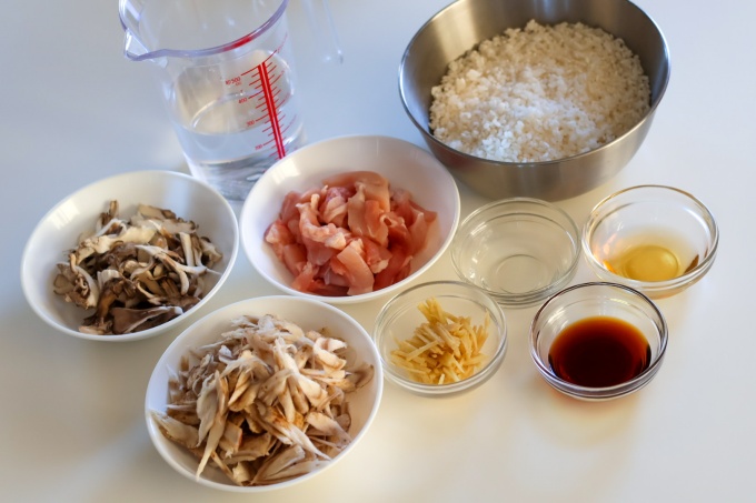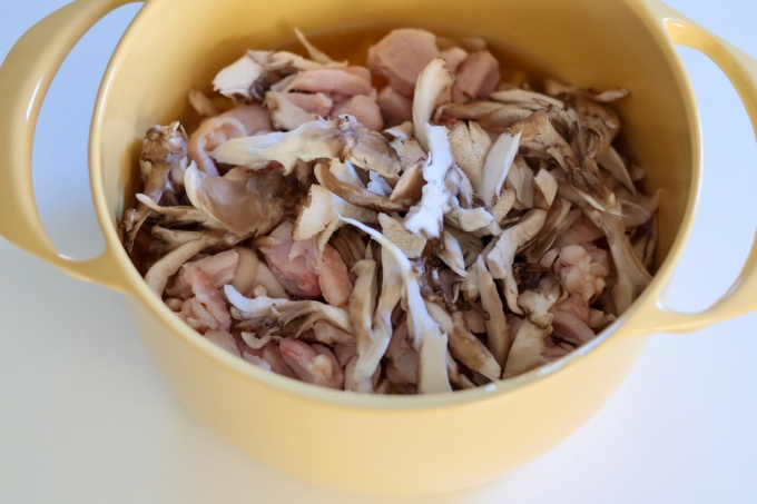 ・ごぼう(半量)、鶏肉、まいたけの順に乗せる。※炊く前は具材をかき混ぜない!