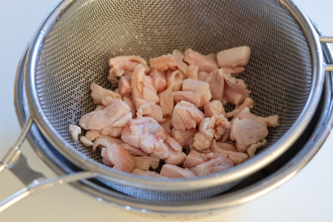 ・沸騰した湯に切った鶏肉をさっとくぐらせる。(くさみ消し)