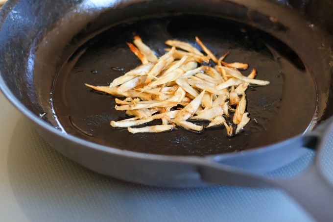 ・ごはんを蒸らしている間に、残りのごぼうをフライパンでソテーする。※少量の油でカリッとするまで!