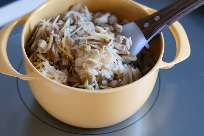 ・蓋を開けて生姜の千切りを入れ全体を混ぜ合わせる。